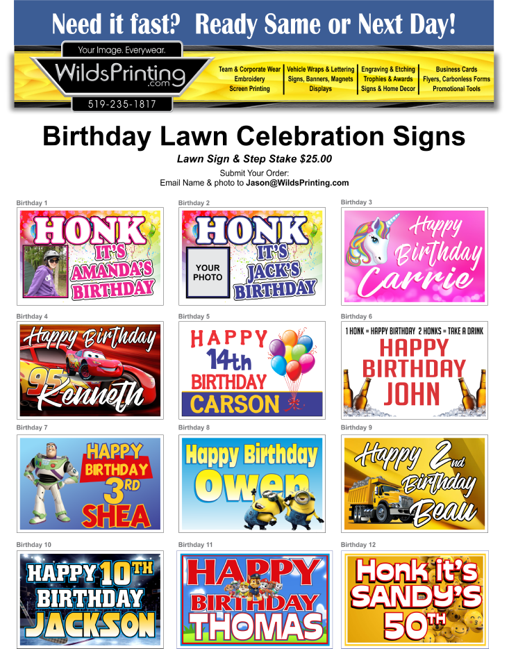 Home Jason@WildsPrinting.com 256 Prince Alfred St. Centralia, Ontario Birthday Lawn Signs Common size of 24” x 16”  Custom sizes available. Email your order and selection to Jason@WildsPrinting.com Please include Sign Option # Photo Birthday Name Age Custom Themes available Graduation