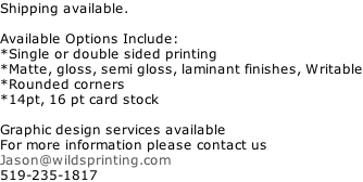 Business Cards For information please email jason@wildsprinting.com Or call 519-235-1817 QUANTITY	 250	 500	 750	 1000	 2500	 5000 $44.826	 $49.798	 $56.578	 $57.595	 $96.015	 $125.96 Premium 14 pt UV Gloss Full Colour, Single Side QUANTITY	 250	 500	 750	 1000	 2500	 5000 $47.82	 $51.79	 $58.57	 $59.59	 $98.01	 $127.96 Premium 14 pt UV Gloss Full Colour, Double Side