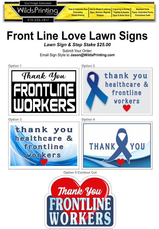 Home Jason@WildsPrinting.com 256 Prince Alfred St. Centralia, Ontario Frontline Support Lawn Signs Common size of 24” x 16”  Custom sizes available. Email your order and selection to Jason@WildsPrinting.com Graduation