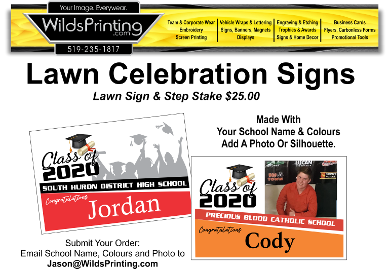 Home Jason@WildsPrinting.com 256 Prince Alfred St. Centralia, Ontario Graduation Lawn Signs Common size of 24” x 16”  Custom sizes available. Email your order and selection to Jason@WildsPrinting.com Please include: Photo Child & School Name School Colours Graduation